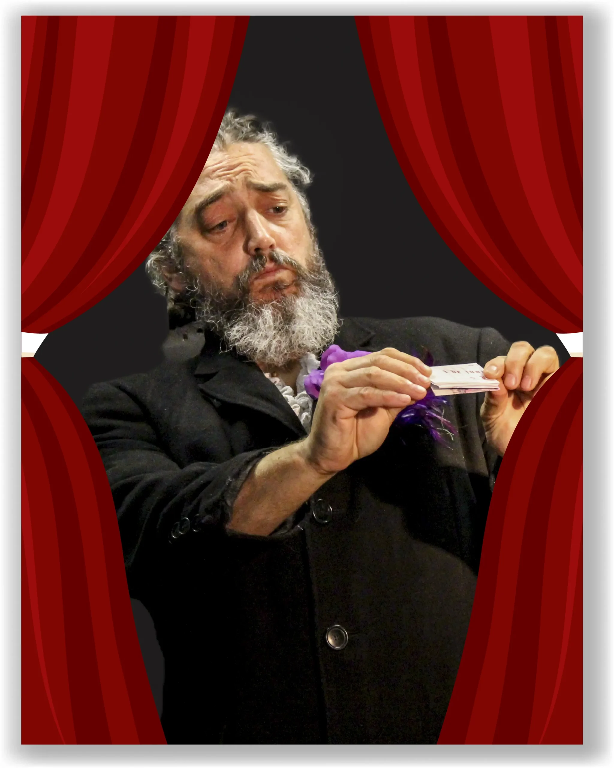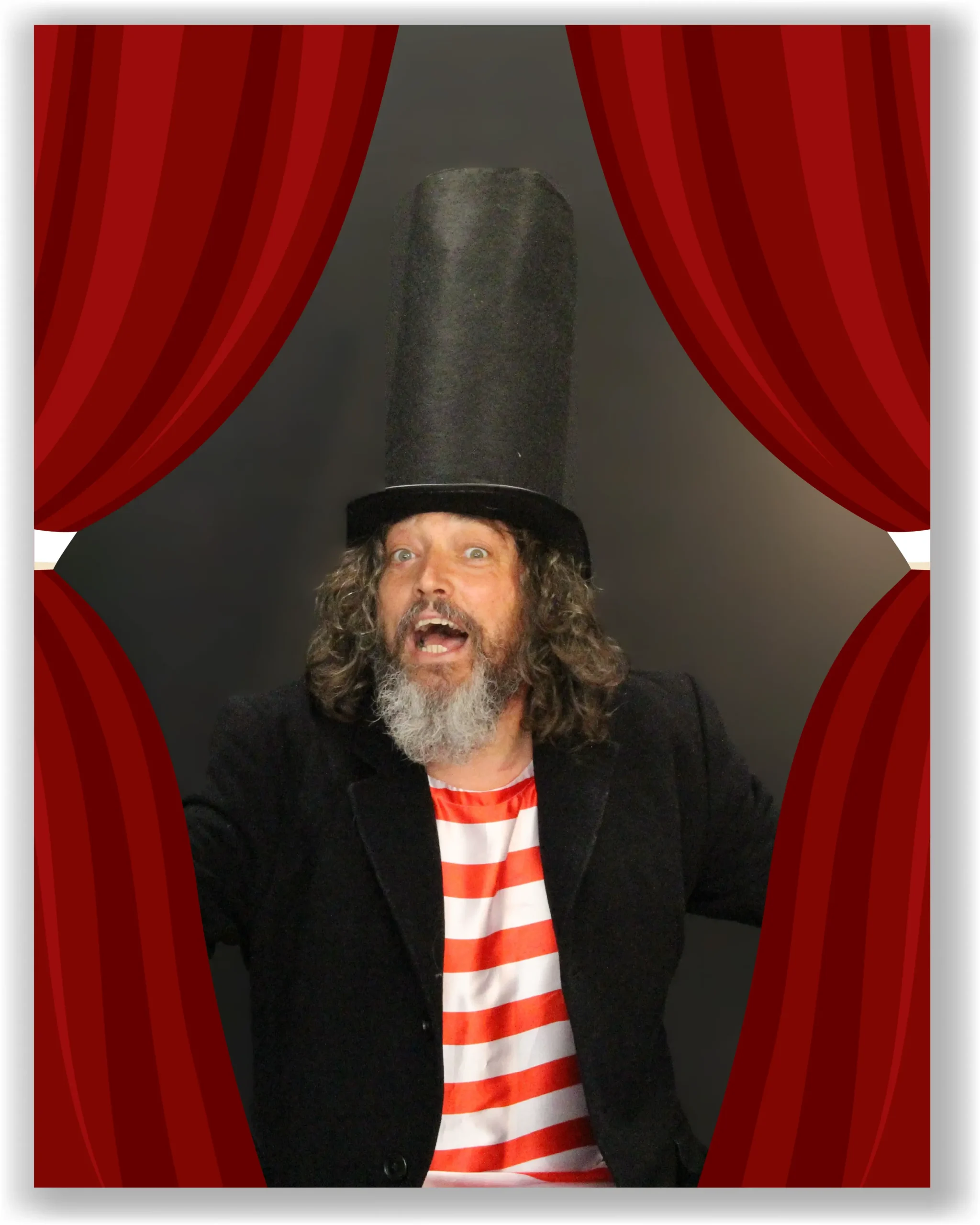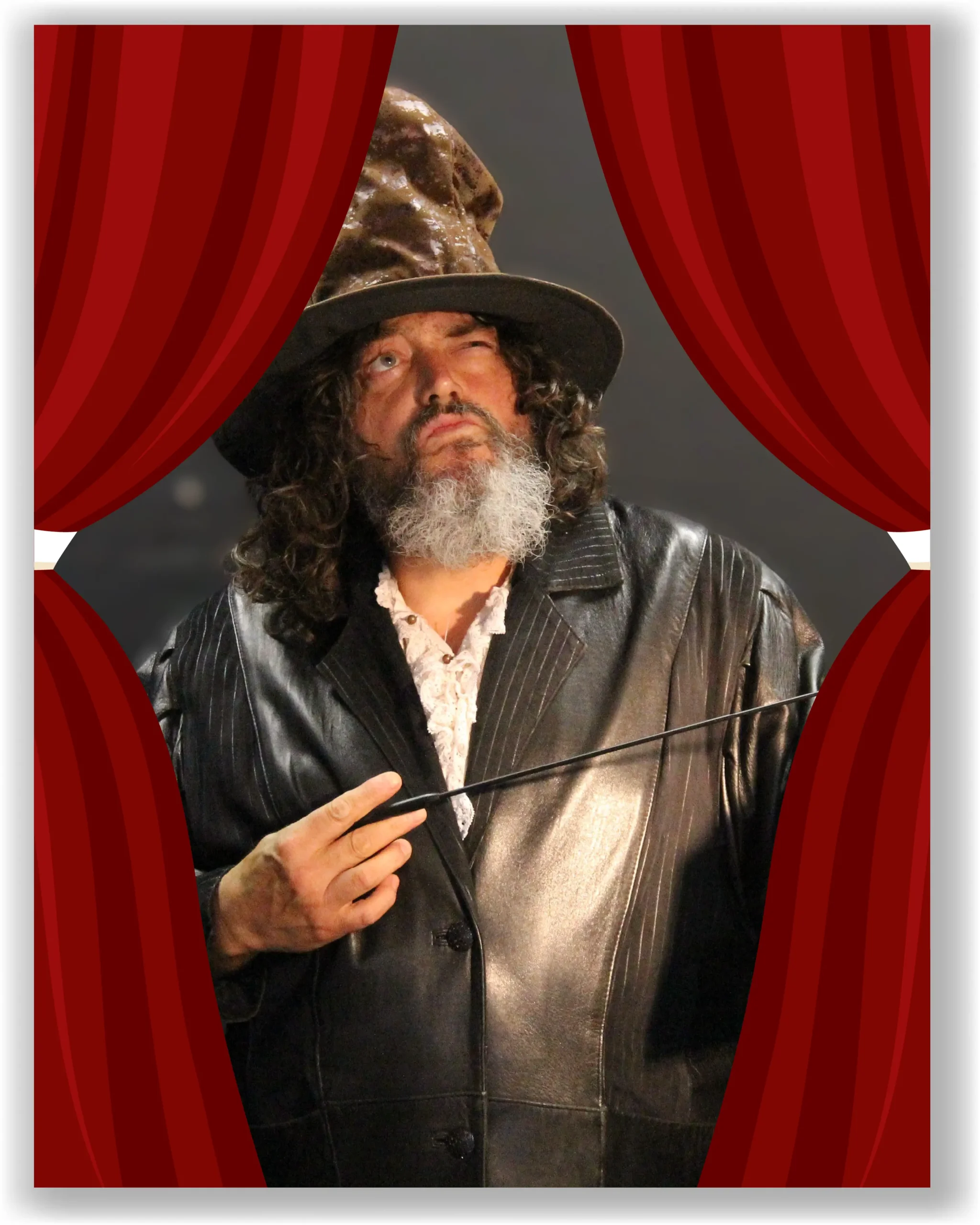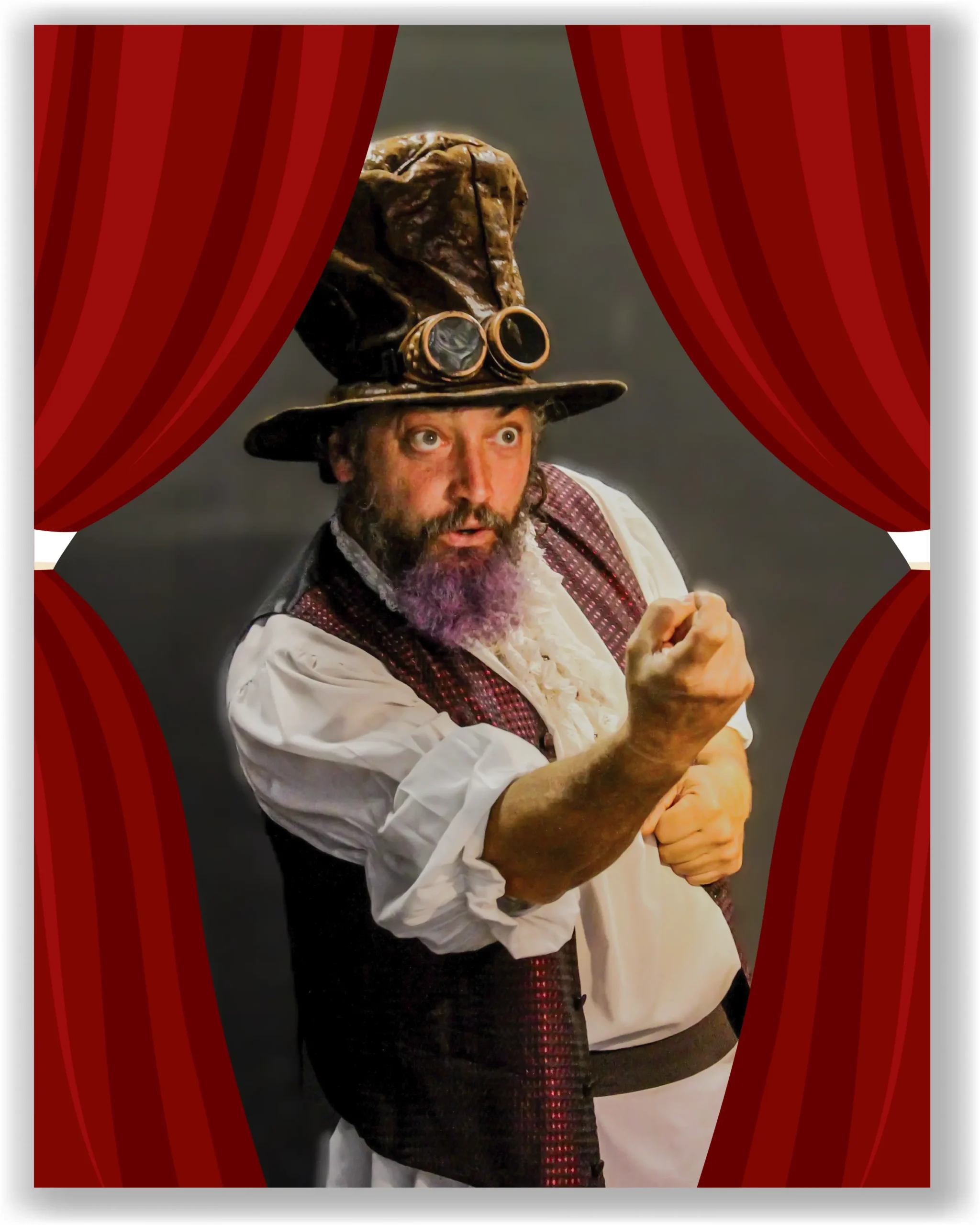 Un viajero incansable con un carromato lleno de historias y el corazón lleno de sonrisas. Improvisa cuentos con cualquier cosa que se cruce en su camino, cambiando imaginación por alegría. Cada parada es un espectáculo y cada relato, una sorpresa.