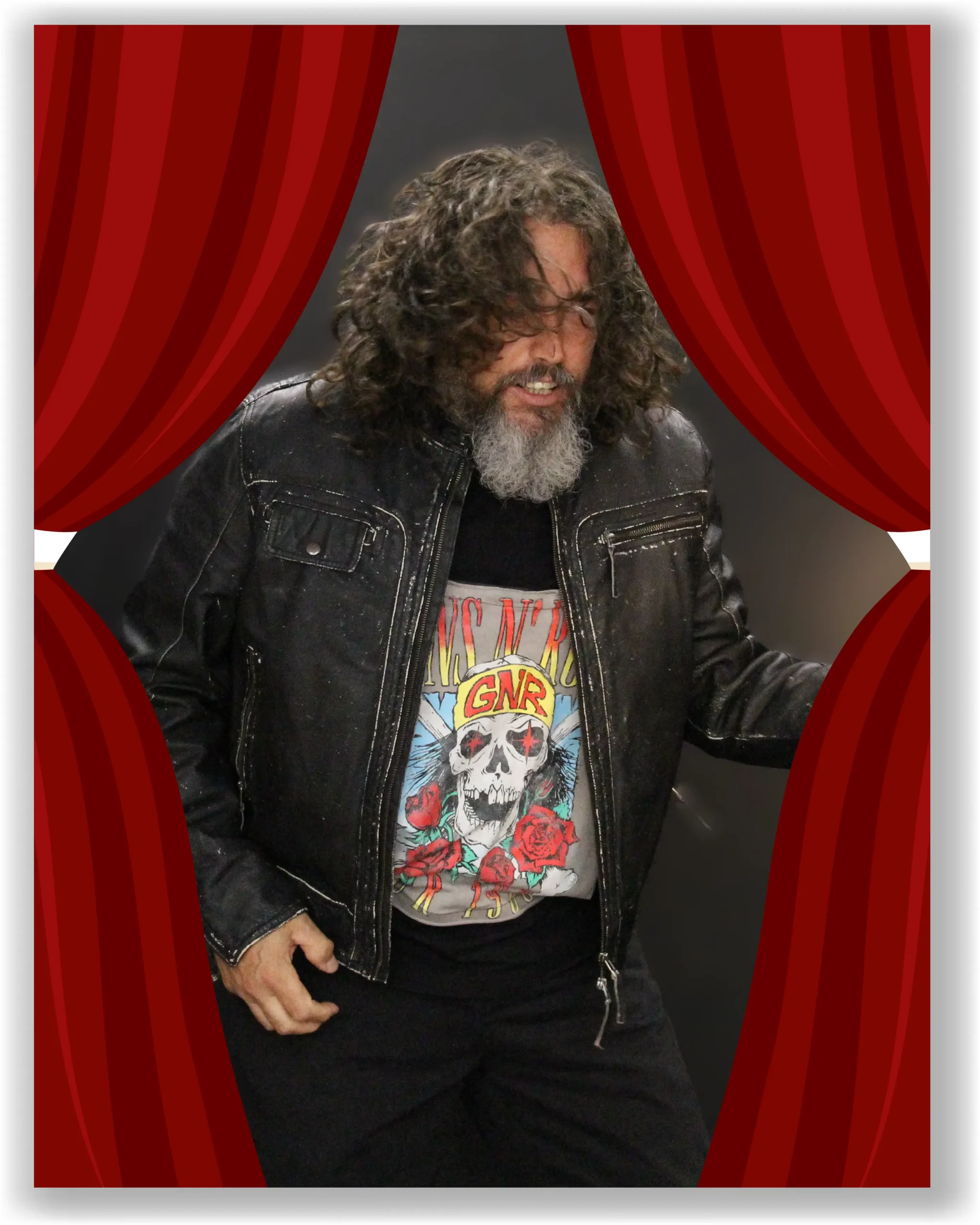 Un heavy veterano con alma joven y corazón noble, que vive entre riffs y estribillos desde los años 80. Sueña con salvar el mundo con su guitarra, predicando entre bares y carcajadas. Rebelde, excéntrico y entrañable, convierte cada acorde en un acto de fe rockera.